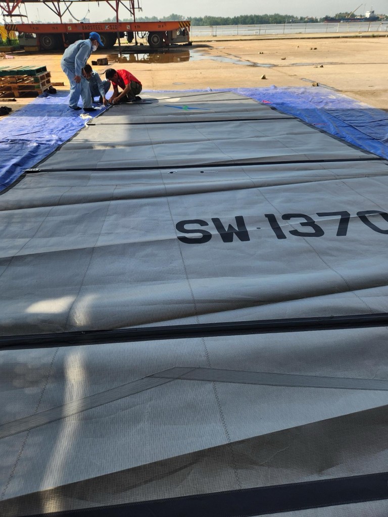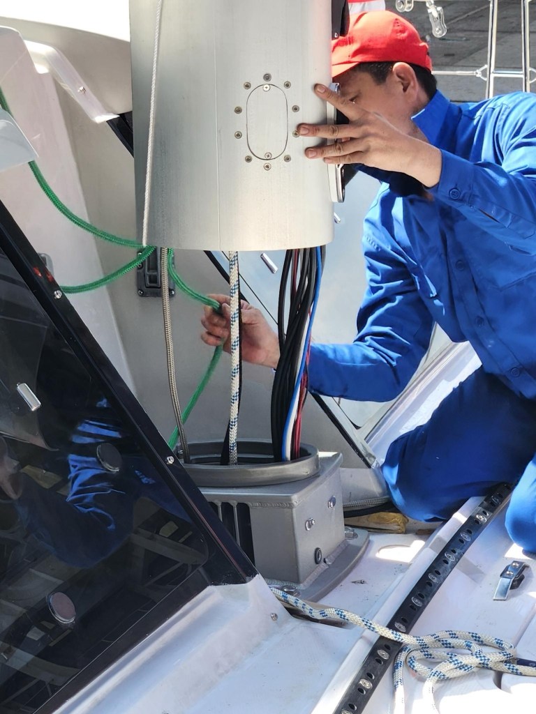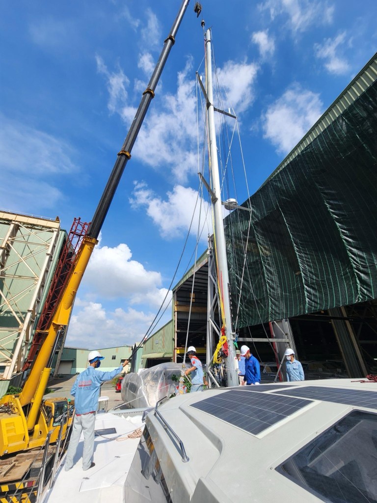 There is a +14 hour difference between Eugene and Vietnam so it is often tomorrow here and yesterday there. We arrived around midnight on Sunday June 23 and went to visit the factory the next day. The boat is in the final stages of completion. The final electronics are being installed, the mast needs to be raised and the sails hanked on. It is whirlwind of activity with the final cleaning being done, quality control people going over the entire boat and checking the instruments, running the engines, the water pumps, the windlass, the solar and on and on.
