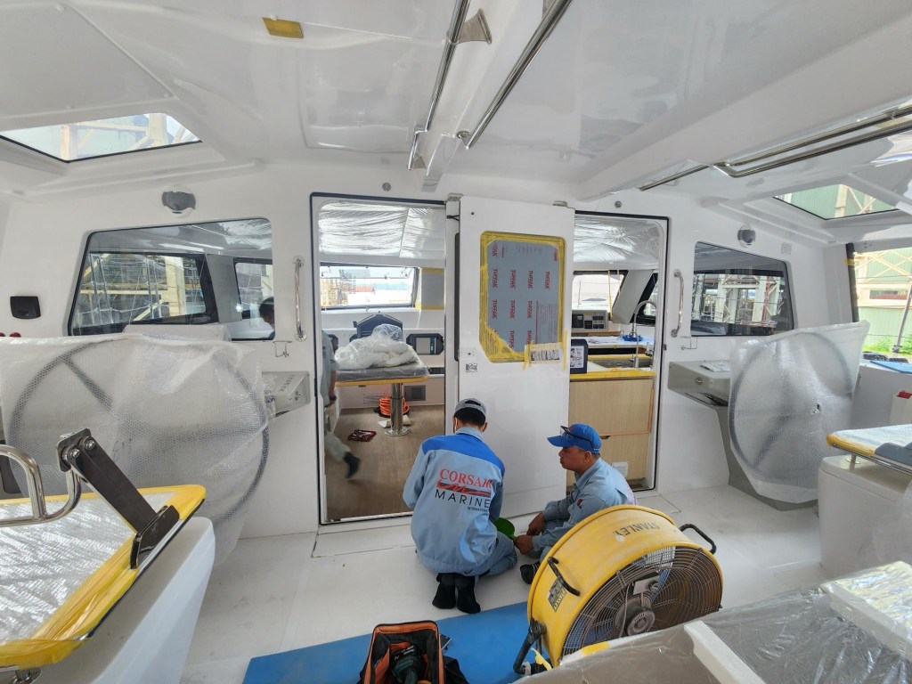 Every morning we leave early, call Grab (Uber in Vietnam) and join the traffic circus of thousands of motor scooters weaving through and against the traffic. It is very much like fish in a stream, cutting across lanes, splitting lanes, occasionally going the other direction in your lane. Everyone gets along and is pretty mellow in the chaos. We arrive at the factory gate, it’s 85-90 degrees and humid. The air smells of fiberglass resin. We walk up to the row of 1370’s in different stages of the build. Ours is last in line. There are a dozen people cleaning her, fixing small blemishes and installing instruments.