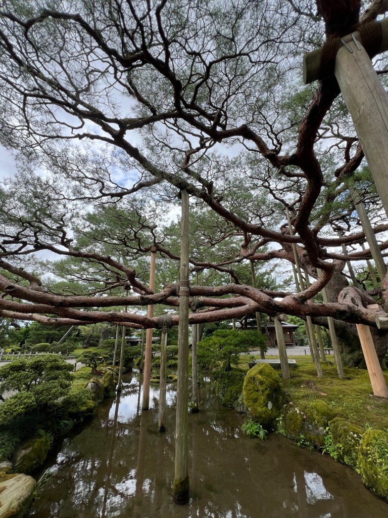 A famous garden next to the castle; Kenroku-en, which has impressive ancient trees with branches held up by many wooden poles. It has a big reservoir which supplies the castle moats and has small pools and cascades. The walks are made with small pebbles which make noise as you walk on them. These are common in gardens and walkways to alert inhabitants of trespassers.