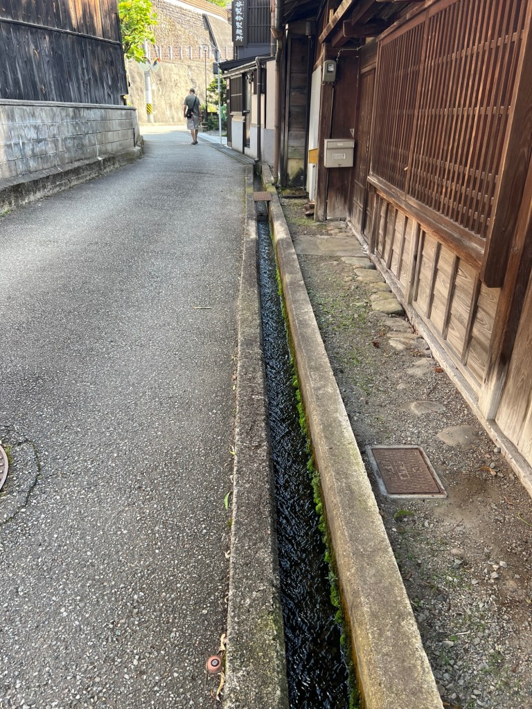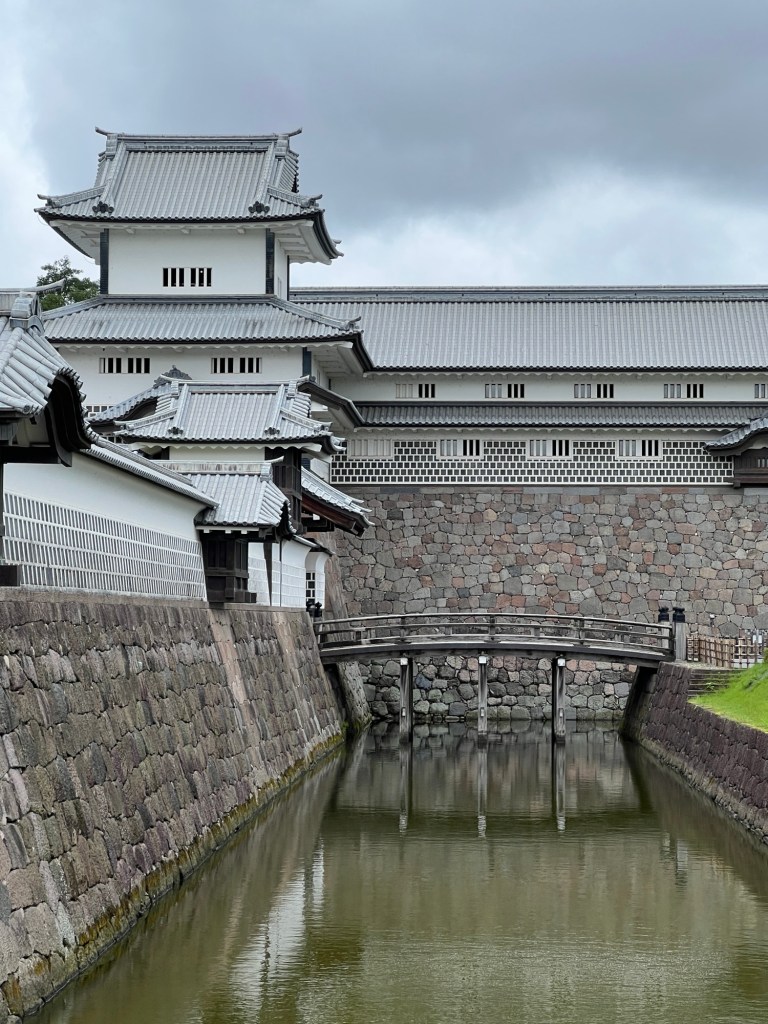 The trip to Kanazawa took three trains, one express and two Shinkansen. We had our first Bnb there; nice to be able to eat breakfast and cook dinner ourselves. We went through the castle there; very impressive although it had burned 3 times and was rebuilt smaller than the original. It was great to see how it was built in layers, first bamboo with clay and straw, then many layers of plaster and then tile over that, with wood lining the inside. All the castles are surrounded by moats and have high stone skirting walls that curve up high, making assault difficult. There are murder holes under the windows where rocks can be dropped.
