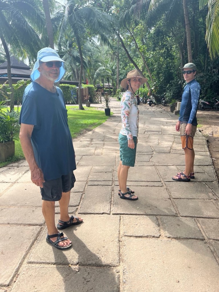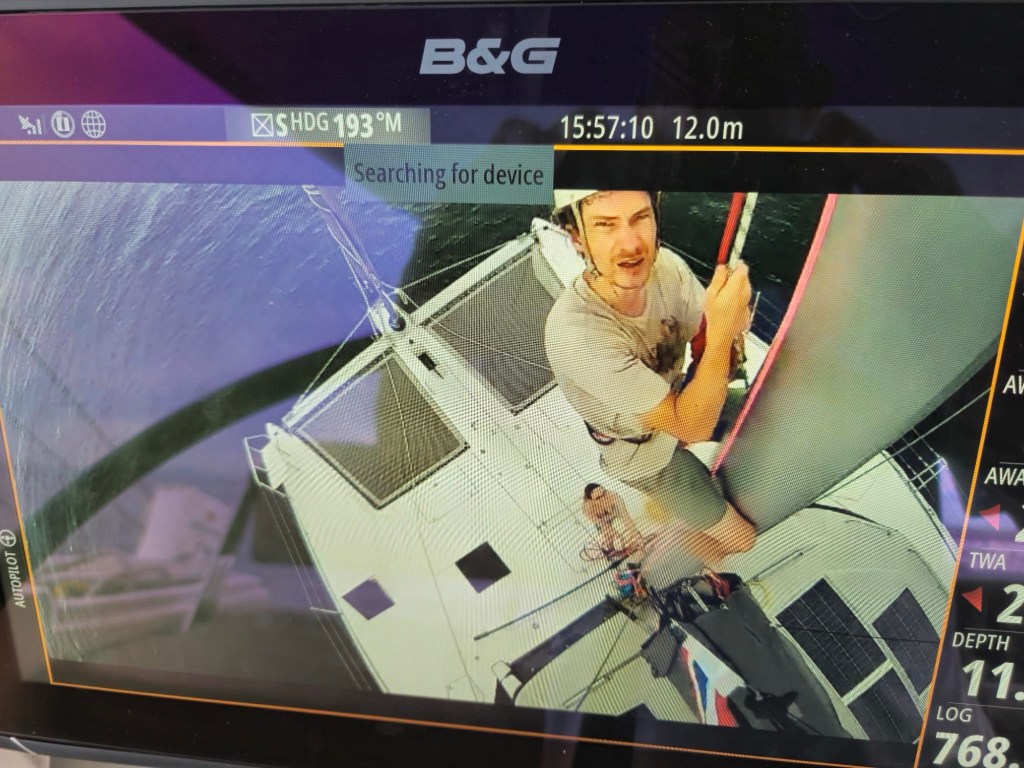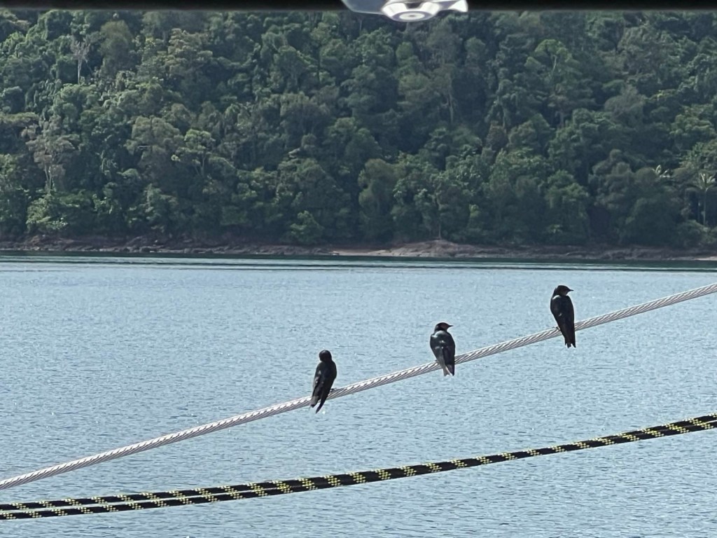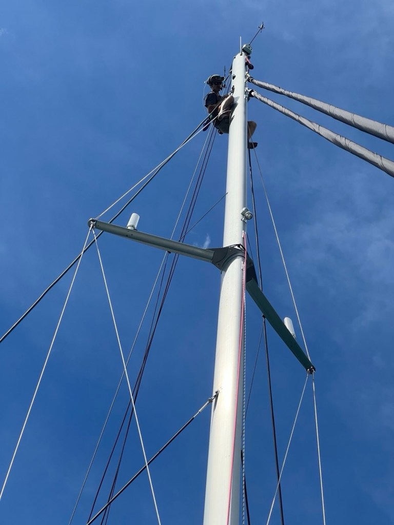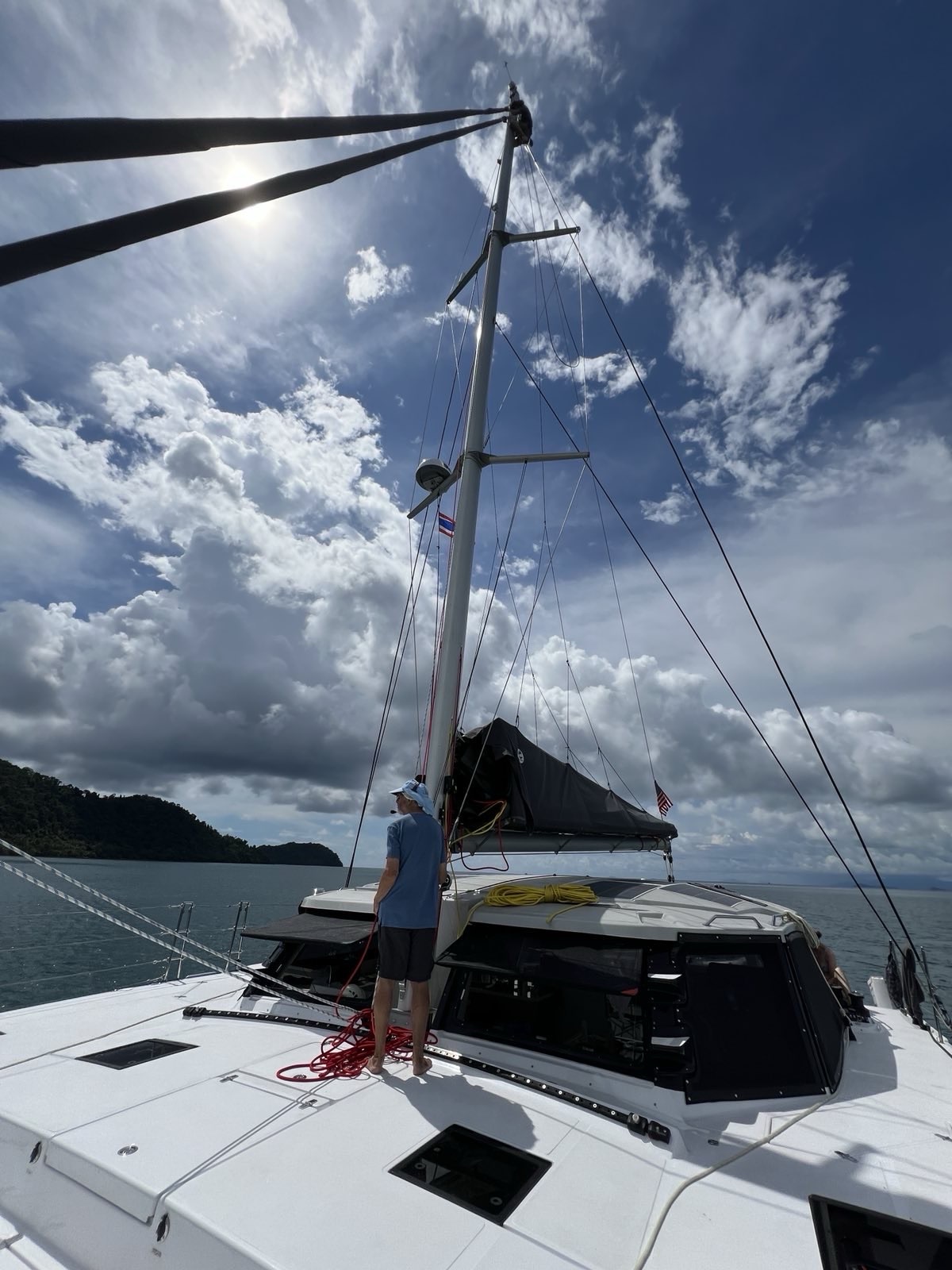 We swam off the boat every morning, and even found a couple fish hiding under the hulls. Si and I picked new fins in Pattaya before we left and they make such difference if there is current pushing you around.  We also did some boat chores, Simon went up the mast to align the spreader camera.
