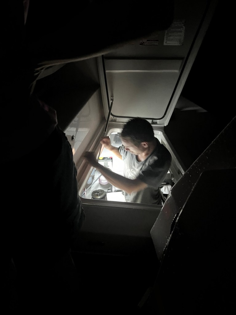 It happened while I was in the shower. There was a lot of thumping footsteps and the port engine turned on. As we’d all taken showers and we were anchored for the night it had to mean something was wrong.